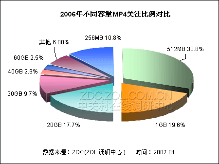 通过这一数据对比,ZDC认为1GB产品在2007年上半年中仍将保持上升的态势,市场关注有望达到50%。容量为20GB的产品虽然关注比例呈现下滑的状态,但是在硬盘式MP4市场上主流地位巩固,是其他容量产品市场关注所不及的。此外,20GB产品是硬盘式MP4市场上产品数量最为丰富的机型,因而ZDC认为20GB产品必将反扑,2007年市场关注将反弹。