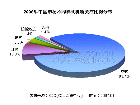 根据ZDC的调查数据显示,2006年立式机箱获得了83.7%的关注比例,超过市场整体关注度的八成,其次是迷你机箱,关注比例达到了10.3个百分点,这两大类机箱的累计关注度高达94%。塔式机箱和超级塔式机箱分别只获得了3.2和1.4个百分点的关注比例,可见立式机箱和迷你机箱的被接受程度和受关注程度更高。