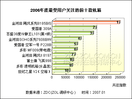 从2006年最热门机箱产品的排行情况来看,价格在200元到300元之间的低端产品最受消费者的青睐。如金河田飓风系列8185B/S、爱国者309A、百盛38度冷静王L101(黑+银)、金河田SOHO系列7606B/W等产品都拥有相当高的人气,金河田飓风系列8185B/S更是成为整个机箱市场的领头羊。