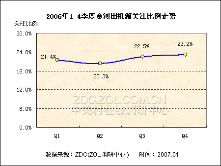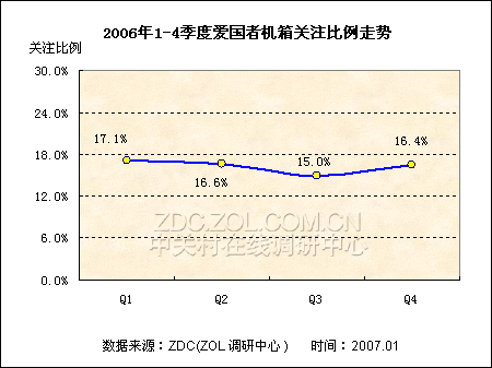根据ZDC的调查数据显示,第一季度是机箱关注度2006年全年最高的时期,关注比例达17.1%,之后这一比例就开始下降,到第二季度时已经下降了0.5个百分点,为16.6%,第三季度再次减少了1.6个百分点,降至15.0%。但是第四季度并没有延续这种下降的趋势,关注度开始反弹,出现了1.4个百分点的涨幅,从而使全年的关注度达到16.0%的水平。