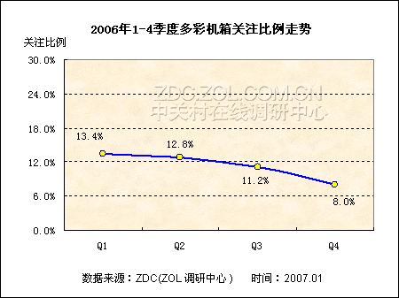 根据ZDC的调查数据显示,从第一季度到第二季度,多彩的关注比例下降了0.6个百分点,第三季度时下降幅度增加到了1.6噶个百分点,关注比例也随之降至11.2%,到第四季度这一比例再次下降,并且下降幅度增加到了3.2个百分点,比第三季度时翻了一倍,关注比例也仅为8.0%。由此可以看出,多彩机箱2006年的关注度起点尽管比较高,但是其关注比例的下降趋势是非常明显的。