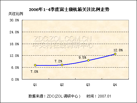 调查数据显示,2006年第一季度富士康机箱的关注比例仅为7.0个百分点,到第二季度时也没有发生太大幅度的变动,只是比第一季度时略涨了0.2个百分点。第三季度富士康的关注度出现了明显的上升,比前一季度增加了2.3个百分点,关注比例上涨至9.5%。第四季度这一比例再次攀升,大幅增加了3.3个百分点,关注比例高达12.8%,从而拉高了富士康2006年全年的品牌整体关注度。