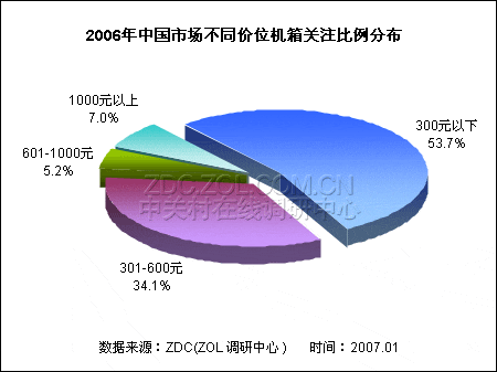 和很多DIY配件产品一样,在机箱市场中,低端主流产品最受消费者的关注,尤其是处于300元以下价位的产品受关注程度最高。根据ZDC的调查数据显示,2006年价格在300元以下的机箱累计获得了53.7%的关注比例,超过市场整体关注度的一半,其次是301-600元的中端产品,关注比例达到34.1的百分点。600元以下产品累计关注度高达87.8%,接近市场整体关注度的九成。600元以上产品的关注度明显不高,601-1000元和1000元以上的关注比例分别只有5.2和7.0个百分点。
