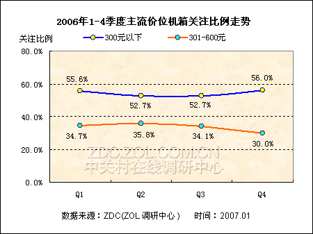 调查显示,600元以下机箱是目前消费者最为关注的对象,其中300元以下和301-600产品在2006年的关注比例分别为53.7%和34.1%。从这两个价位的产品关注比例的走势来看,2006年第一季度到第四季度300元以下机箱的关注度发展相对比较稳定。