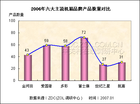 从六大品牌的产品数量对比情况来看,关注度名列第四的富士康旗下的产品数量最多,其次是爱国者和多彩。而2006年最受关注的机箱品牌——金河田旗下一共有43款市售产品。航嘉和世纪之星的产品数量相对比较少。