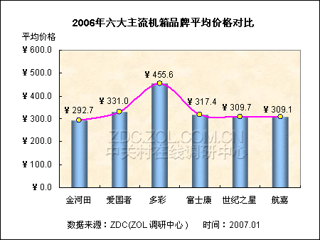 根据ZDC对2006年六大品牌机箱进行的价格监测数据显示,最受消费者关注的金河田产品平均价格最低,仅为292.7元,产品均价最高的是多彩,为455.6元,比金河田足足高出一半。