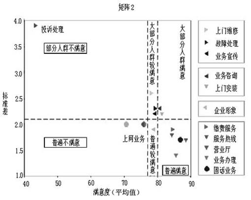 矩阵2是根据市场对产品或服务项目的满意度评价,及通过计算满意度的标准差而设计,现根据通信部门的服务项目举例如下: