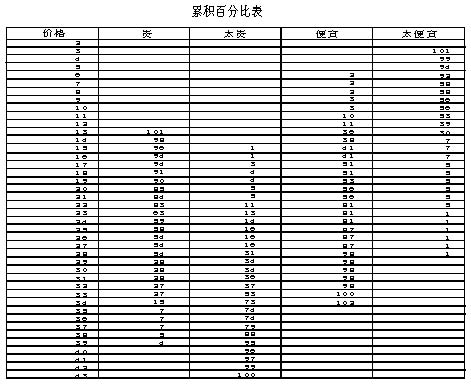 1.首先介绍累积百分比表,它是针对表中各价位,进行贵、太贵、便宜和太便宜四种顾客态度测试,求出各价位频率后进行正向和反向累积后的结果,该表主要为下一步作图进行准备。