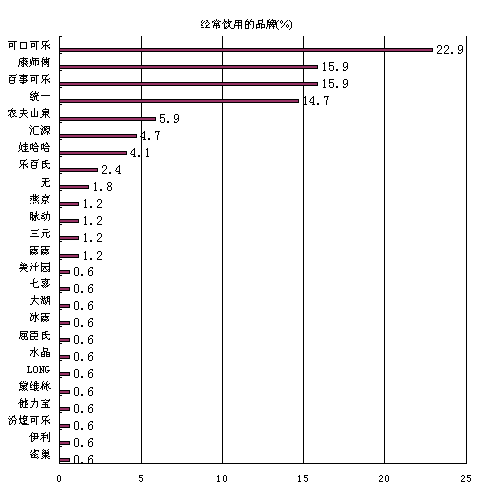 1、在消费量方面,可口可乐依然是龙头老大,以23%的消费面匹马领先。紧随其后的,是康师傅、百事可乐,皆为16%,统一为15%,三者不相上下鼎足而立。