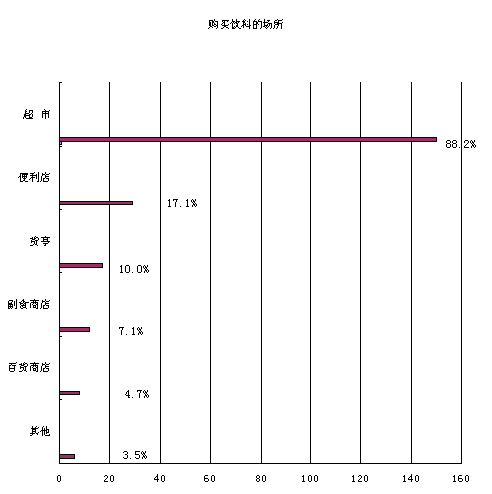 如图,人们购买饮料的场所主要在超市,88%的消费者在这里购买。这种倾向与性别亦有一定的关联,女性比男性更倾向于超市消费,这也许与购买批量有关。一般超市购买时都是比较大量的采购,而临时性的消费则以男性居多,临时性消费对场所的选择性不强,一般以方便为主。