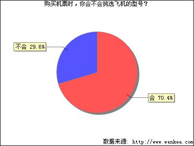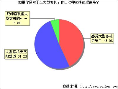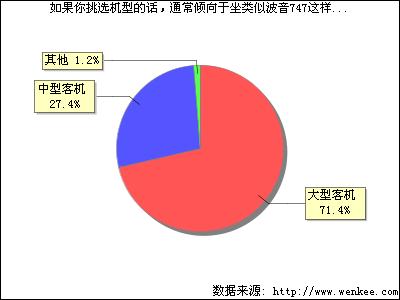 调查显示,有70.4%的乘客在决定购买机票的时候会选择自己坐的飞机型号,其中又有71.4%的乘客表示只考虑波音747这样的大型飞机,超过50%的人选择大型飞机的理由是因为大型飞机宽敞,舒适性好,另有43%的乘客注重飞机的安全型从而选择大型飞机。