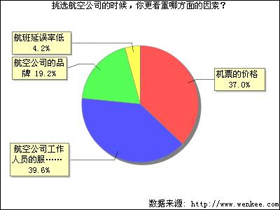 在选择航空公司的时候,有37%的人看重价格,会在各航空公司之间比较选择折扣最高的航空公司的航班,更有39.6%的人把服务放在了第一位,他们认为机票的价格相对其他交通工具是很高的,所以应该享受到优质的服务。此外航班正点情况,航空公司的品牌知名度也是小部分人在做决定时候考虑的因素。