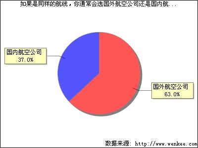 通过调查,我们发现国内航空公司在同国外航空公司竞争的时候明显处于不利的一方,只有37%的人表示会选择国内航空公司,国外航空公司的机票价格比国内的要高,但是依然不能阻止63%的人明确表示选择国外航空公司。