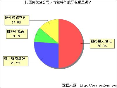 我们要看到自己的差距,硬件是一方面,14%的人把硬件设施是否充足作为选择航空公司的标准,所以选择外航,但更多的人注重的是软件,比如航班延误情况,飞机上的餐食质量都在大家考虑的范围之内。国内航空公司最应该像外航学习的地方是服务,50%的乘客认为这一点上外航的服务更人性化。