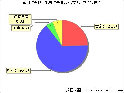 根据我们的调查,在预定机票时考虑电子客票的占受访者65%,可说人们现在对电子客票的接受程度已经比较高了。