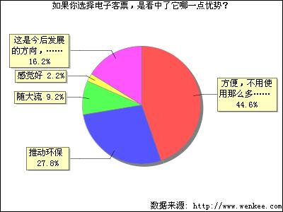 而选择电子客票的原因中,方便,不使用那么多现金成为首要因素,占44.6%,其次,是推动环保,占27.8%,这说明电子客票吸引消费者最重要的就是方便和环保。
