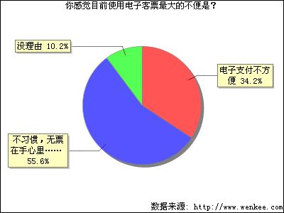 然而,消费者对于电子客票也不是全无顾虑的,其中55.6%的受访者就对于无票在手心里没底比较在意,而34.2%的受访者对于电子支付的不方便而矛盾,这两者合计占了全部受访者的近九成,