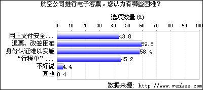消费者对于电子客票退票、改签的顾虑是最大的,占到受访者59.8%,身份认证难以实施占到58.4%,这也将会是电子客票实际操作中比较大的问题之一,这就需要电子客票的经营者全面考虑消费者的需要,推出更加人性化的服务,消除消费者的顾虑!