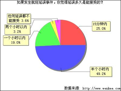 我们的调查还显示,乘客在对如今航空界普遍存在的班机延误现象深恶痛绝的同时,也表示了一定的理解。25%能接受15分钟以内的延误,49.2%的乘客能接受半个小时内的航班延误,明确表示任何延误都不能接受的只占被调查者的3.6%。