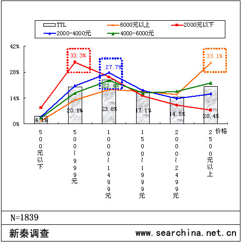 调查显示,在1839个打算近期购买新影碟机的被访者当中,有76个被访者能够承受500元以下的影碟机,所占的比例为4.1%;有369个被访者能够承受500-999元的影碟机,所占的比例为20.1%;有438个被访者能够承受1000-1499元的影碟机,所占的比例为23.8%;有314个被访者能够承受1500-1999元的影碟机,所占的比例为17.1%;有267个被访者能够承受2000-2499元的影碟机,所占的比例为14.5%;有375个被访者能够承受2500元以上的影碟机,所占的比例为20.4%。