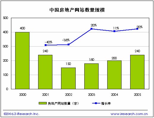 根据iResearch的统计表明,在2000年时,中国各类大小房地产网络媒体的数量最多,此后两年,随着中国互联网泡沫的影响,中国房地产网络媒体的数量锐减。此后随着2003年中国互联网经济的复苏,专业房地产网络媒体的数量又有回升。2004-2005年中国房地产业高速发展,作为房地产服务的房地产网络媒体数量也增长很快。2005年,中国房地产网络媒体数量达到240余家。