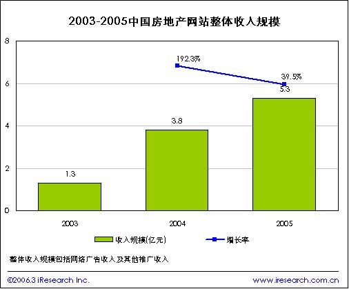 2003年底,中国房地产网络媒体的总体收入有1.3亿元,到2004年,这一数字已经达到了3.8亿元。2005年中国房地产网络媒体的总体收入达到了5.3亿元,包括广告收入,信息收入以及其他(房产报告、一体化推广费用、房源信息登陆、业主数据库)的收入费用。