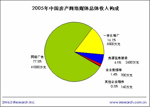 中国房地产网络媒体中,网络广告是主要收入来源。随着网络广告的发展和房地产业的迅速增长,房地产网络广告收入也增长迅速。根据iResearch的统计数据,2005年中国房地产网络媒体广告收入达到4.1亿元。