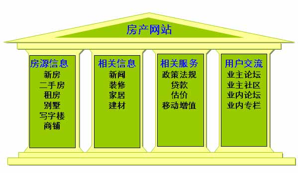 目前国内房产网站的内容,以房源信息、相关新闻信息、相关内容服务以及用户交流为主,其中房源信息包括有新房、二手房、租房、别墅、写字楼、商铺等信息。相关新闻信息中包括有房产新闻、装修、家居及建材类而相关内容服务中则有政策法规、贷款、估价、移动增值等信息。而用户交流则以业主社区为主。