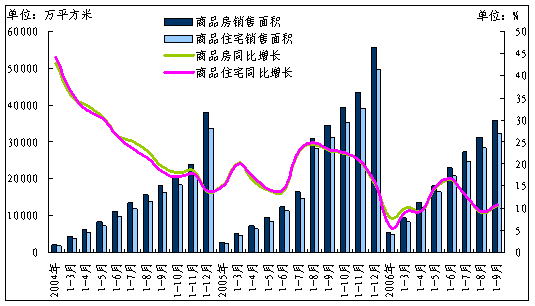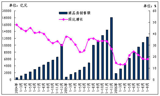 2004年-2006年9月全国商品房销售面积及同比增长情况