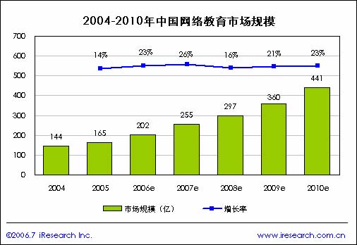 从总体情况看,中国的网络教育市场总体处于起步阶段。2005年中国网络教育市场规模达到165亿元,同比2004年增长14%。但随着中国的信息化程度、网民对网络教育认知程度、学历教育社会的认可度的提高,网络教育市场规模将快速增长。iResearch艾瑞市场咨询预测,在2008年、2009年以及2010年中国网络市场将分别达到297亿元、360亿元以及441亿元。