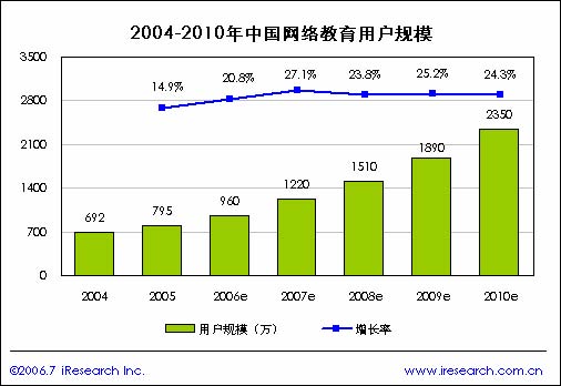 随着国家经济的飞速发展,知识成为第一生产力,人们对知识的重视超过以往的任何一个年代;随着我国网民快速增长和对电脑操作水平的提高;随着国家对网络教育的支持;网络教育已成为高考失利、教学辅导、技能培训等人群重要的学习方式,近几年我国网络教育正呈现快速增长趋势,2005年中国网络教育用户达到795万人,iResearch艾瑞市场咨询预测到2008年将达到1510万人,2010年将达到2350万。