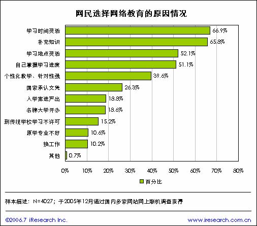 艾瑞市场咨询分析时间地点的灵活性和人们对知识的需求,今后几年将一直是网民选择网教育的主要原因。