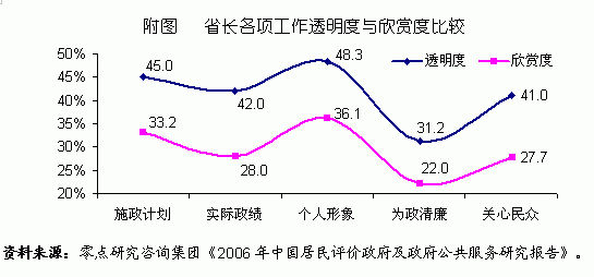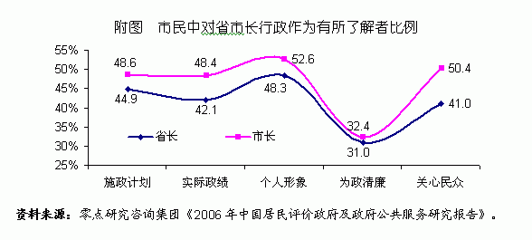 零点首次针对省市长公众支持度的实验性对比调查显示,市民对于省长工作与本人情况的认知度不如市长,这直接影响到了市民对于市长的支持度高于省长。本次调查结果在12月19日召开的第二届公共服务评价国际研讨会上公布。近年来,政府陆续出台了新政策以加强公共行政活动的公开性,确保政府的透明度和公众对政府公共行政活动的知情权。在各级政府政务公开承诺的鼓励下,公众对于公共事务管理的关注程度和评判能力不断提高。《2006年中国居民评价政府及政府公共服务研究报告》结果显示:现任省市长的政务透明度不高,影响了公众对政府管理社会事务的信心。提升政务透明度是获得民意支持的关键,这点对省长更为重要。