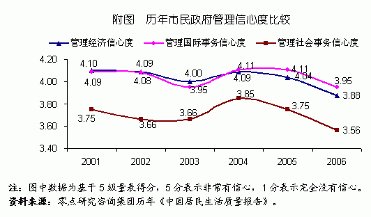 零点研究咨询集团历年的《中国居民生活质量报告》结果显示:市民对政府管理社会事务的信心一直处于低位,明显不及对政府管理经济和国际事务的信心,特别是对于政府能否使干部队伍更加廉洁信心不足(得分为3.44分)。这在一定程度上表明低透明度会严重下拉公众对政府管理社会事务的信心。