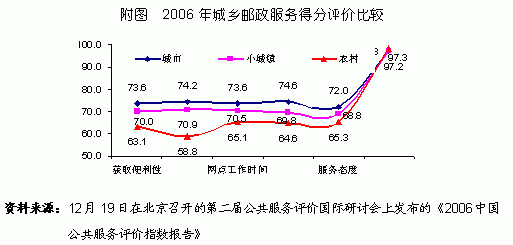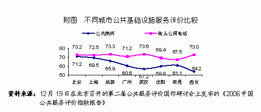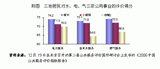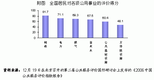 12月19日在北京召开的第二届公共服务评价国际研讨会上发布的《2006中国公共服务评价指数报告》调查结果显示:我国公用事业建设仍处于初中级发展阶段水平,居民对公用事业的总体评价得分为66.95分。总体来看,邮政服务比较令人满意;水电气服务存在价格偏高问题,并且农村地区的发展水平明显落后于城镇地区;城市地区公共厕所等公共基础设施建设比较落后,农村地区文体娱乐设施的比较匮乏,业余娱乐生活质量首次成为影响农村居民总体生活满意度的第一重要因素。与零点的其他商业服务指数相比,公用事业指数得分较低,与商业服务指数如民航指数(73.62分)、电信指数(72.24分)、银行指数等(71.19分)仍存一定距离,可见现阶段的公用事业还不是高水平的商业服务。