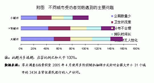 但是各个城市在公厕建设上,居民评价差异明显,相较而言,北京市民最满意,西安市民最不满。同时不同规模的城市面临的公厕问题各不相同,各有偏重。2005年4月零点关于公共厕所的一项调查研究数据显示,厕所数量缺乏是各个城市面对的共同问题。特别的,大城市如厕困难突出,其中五成居民感到公厕数量较少,三成居民认为其公厕分布不合理,因此接近三成居民必须忍耐更长的等待时间,以图一时之快。