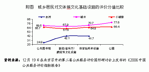 《2006年中国居民生活质量报告》结果显示,业余娱乐生活首次成为影响农村居民生活满意度的首要因素。但是本次结果表明五成中国居民认为文体娱设施服务缺乏,该指标在全国的综合得分仅为48.08分。特别的,九成农村居民表示当地没有任何公共图书馆(包括村委会、工厂等组织和创办的面向所有村民的图书借阅场所),普遍存在着“看书难”的现象。随着经济收入水平的增长,居民日益增长的娱乐文化需求与逾显稀缺的文体娱设施形成鲜明对比。