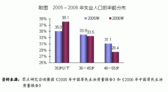 在2005和2006年,失业人群的低龄化趋势逐渐显现。在2005年调查所涉及到的失业人群中,35岁以下的青年人占了35%;而在2006年调查所涉及到的失业人群中,35岁以下的青年人占到了38.1%。与之相比,46-55岁失业群体的比例有所下降,表明这几年政府针对40、50人员所做的再就业工程逐渐产生成效,但是针对年轻人的就业服务亟待加强。