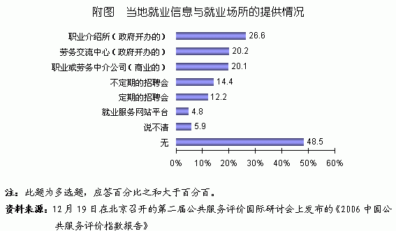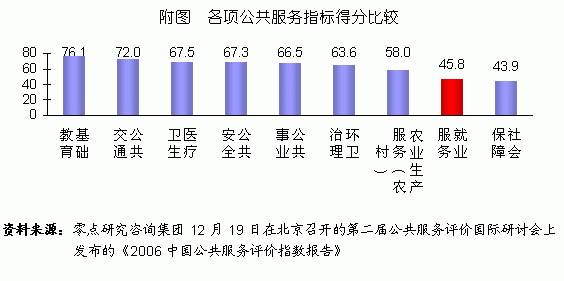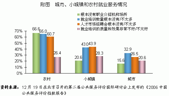 就业服务是公共服务体系中的一个重要组成部分。《2006中国公共服务评价指数报告》的调查结果显示:公众对于就业服务的满意程度较低(45.8分),除了略高于社会保障服务(43.9分)外,与其它各项公共服务水平相比存在一定差距。城乡三地居民对当地政府的就业服务表示不满意者比例均高于表示满意者,特别在小城镇和农村地区,对当地政府就业副务表示不满意的受访者比例分别达到了38.5%和36.2%。