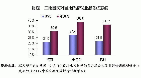 零点研究咨询集团最新公布的《2006年中国居民生活质量报告》以及在第二届公共服务评价国际研讨会上发布的《2006中国公共服务评价指数报告》的调查结果显示:就业问题仍然是中国城镇居民的关注重点,同时失业群体低龄化是近年来出现的新趋势。一方面是巨大的就业压力形势,另一方面社会提供的各项就业服务却不能满足相应的需求,就业问题依然是公众和政府的心头之患。