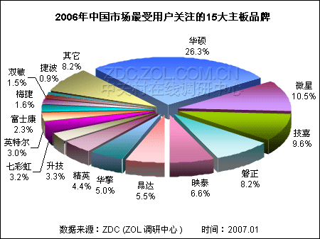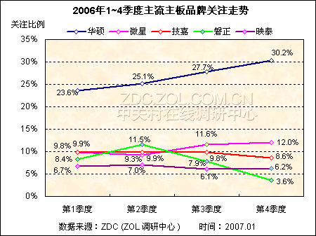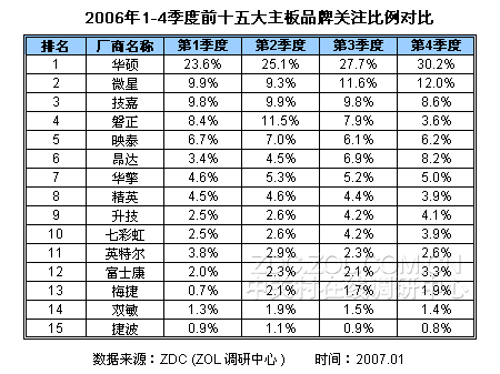 通过数据对比以及品牌之间的关注度排行分布状况,2006年主板市场的品牌格局呈现出以下特点: