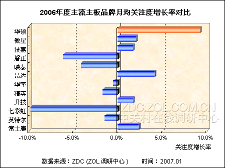 调查显示,华硕以9.3%的关注度增长率成为2006年度主板市场中的最大赢家。华硕是中国乃至全球中最著名的主板品牌,在今年下半年并购技嘉主板部门以后,华硕的市场地位更是无人能及。