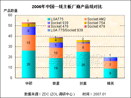 在Socket478和Socket479等即将淘汰的非主流平台上,各厂商基本没什么产品分布。通过调查结果可见,各大厂商的主流产品都集中在LGA775和SocketAM2中,其中华硕的产品线最丰富。