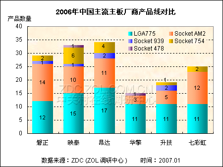通过调查结果可见,磐正、映泰等六家主流厂商的产品分布同样集中在LGA775和SocketAM2中。昂达和映泰的产品线都很丰富,且在Intel和AMD两大平台上分布均衡;磐正在AMD平台市场最具优势;华擎则更倾向Intel平台,其LGA775产品接近自身产品线的3/4。