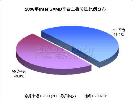 调查显示,在Intel与AMD平台的用户关注度对比中,Intel的关注比例略高,为51%,AMD为49%。在下半年,AMDSocketAM2平台的呼声很高,但Intel凭借Core架构仍以2个百分点的微弱优势压制住了AM2平台的迅猛攻势。