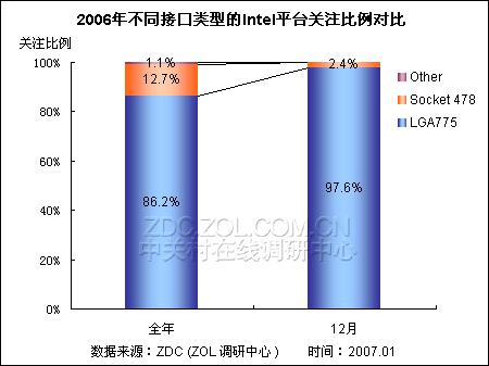 调查显示,LGA775平台在2006年平均关注比例为86.2%,Socket478平台的关注比例为12.7%。对比12月份数据,LGA775平台的关注比例已高达97.6%,留给Socket478平台的份额仅为2.4%。可以看出,LGA775平台基本吞噬了整个Intel主板市场。