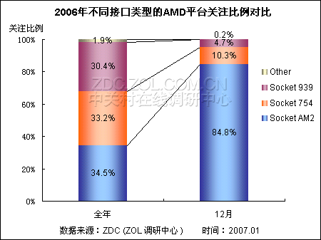 调查显示,SocketAM2、Socket754和Socket939平台在2006年平均关注比例比较接近,分别为34.5%、33.2%和30.4%。对比12月份数据,SocketAM2平台的关注比例已扩大到84.8%,而Socket754和Socket939的关注比例均急剧下降,分别为10.3%和4.7%。