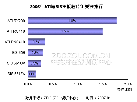 ATI在主板芯片组市场的局面并不乐观,尽管目前已由AMD接管,但短期内仍难以力挽狂澜。在2006年,最受用户关注的前三款ATI芯片组分别是ATIRX200、ATIRX410和ATIRXC410,所获关注比例依次为1.8%、1.5%和0.3%。