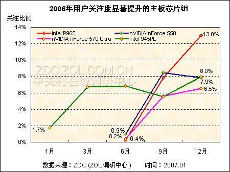 值得一提的是IntelP965芯片组,其在今年6月份正式发布,仅通过半年的累计关注度便成为第三大最受用户关注度的Intel芯片组,所获关注比例为3.9%。