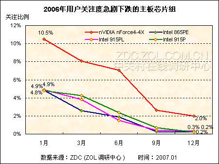 Intel915P和Intel915PL分别获得了2.5%和2.2%的关注比例,堪称经典之作的Intel865PE也在2006年得到了2.0%的关注比例。